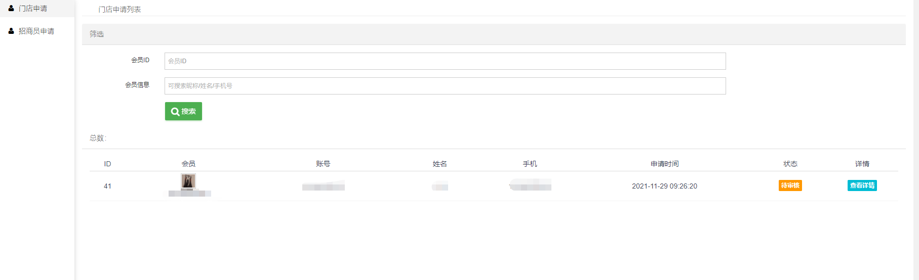 2)申请:会员申请,后台通过审核后即可成为招商员;