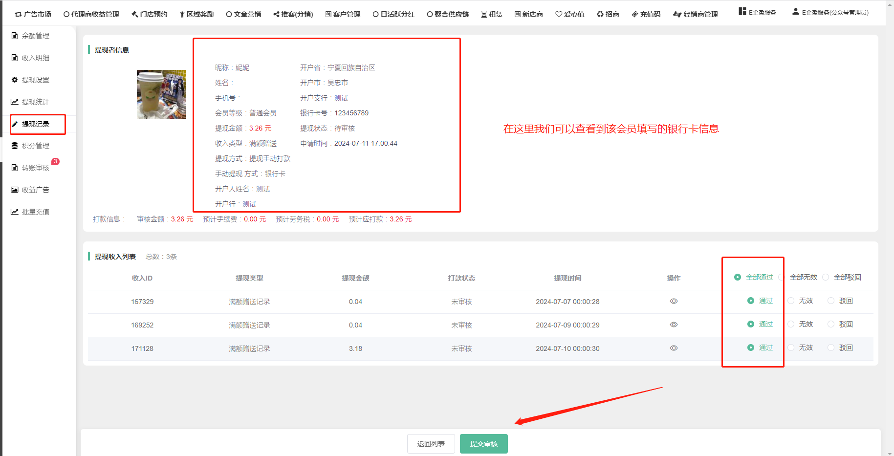2.该页面我们可以查看到该会员填写的银行卡信息,选择提交审核