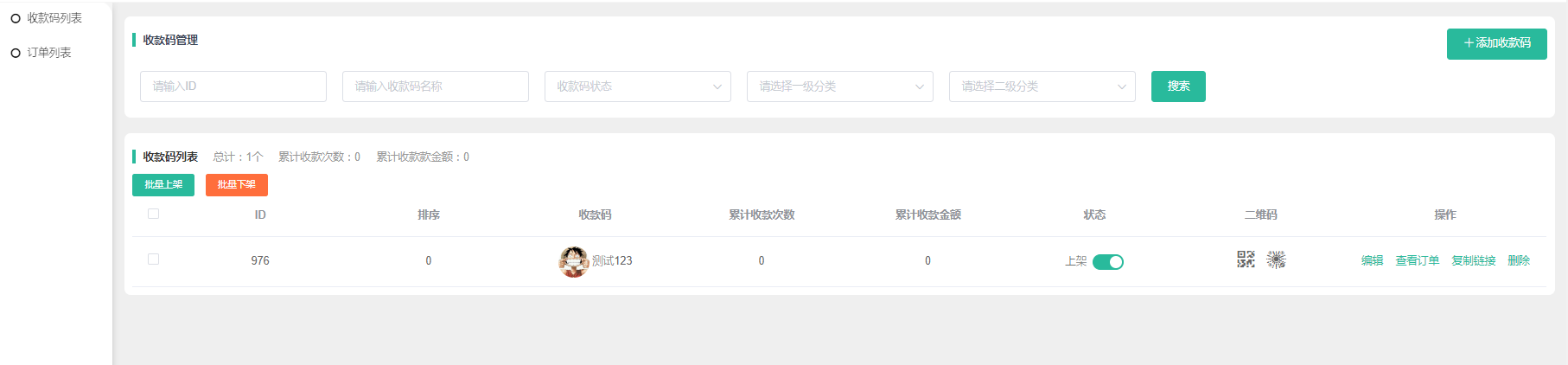 可根据收款码ID、收款码名称、收款码上下架状态、收款码分类快速查找,可查看到收款码累计收款次数、累计收款金额(已完成订单)、查看对应扫码买单订单.