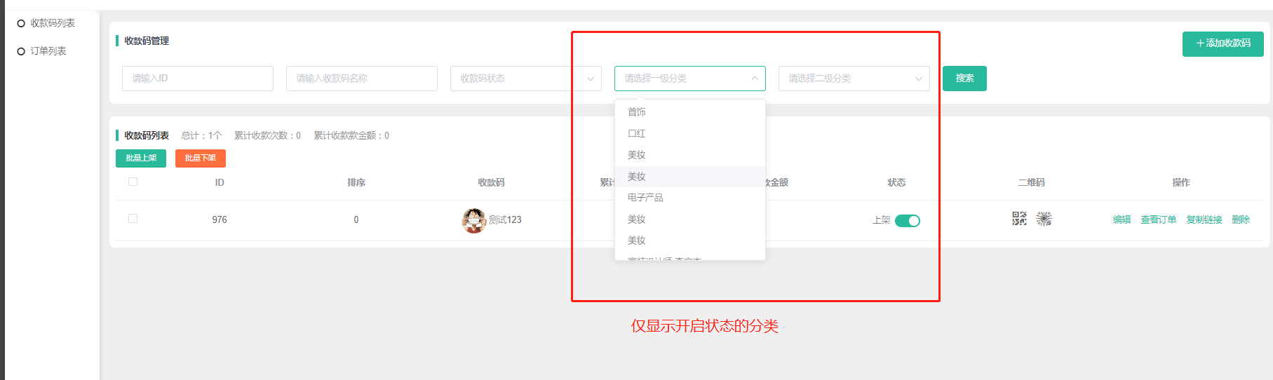 (1)收款码列表分类,仅显示开启状态的商品分类。