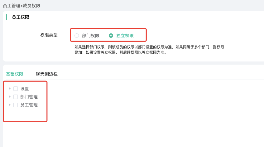 每一个员工可以单独在员工管理中设置独立的权限,独立权限优先级大于部门主管、成员权限。