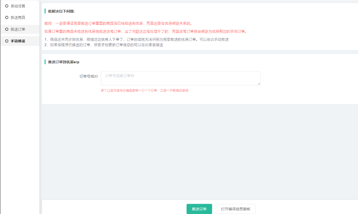 1)一定要保证需要推送订单里面的商品是已经推送到优易,而且还要在优易绑定关系的。