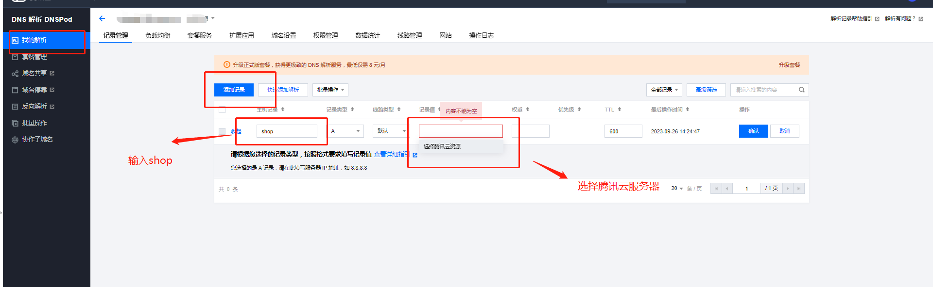1、登录 DNSPod 管理控制台 快速添加解析。如下图所示: