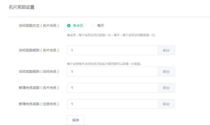 3)新增会员奖励-名片会员:通过名片会员页面访问注册一个新的会员,名片会员获得的奖励。